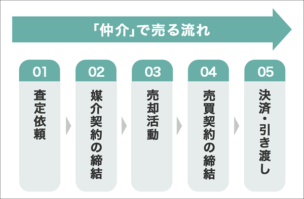 仲介で不動産を売る場合の流れは上図のとおりです。まずは査定を依頼し、仲介してもらう不動産会社を選定します。続いて、不動産会社と媒介契約を締結して売却活動がスタートします。