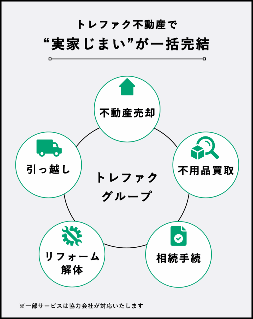 国内外に300店舗以上のリユースショップを展開するトレジャーファクトリーが手がける「トレファク不動産」なら、家の中の不用品買取から不動産売買までトータルでサポート。「実家の売却って何から始めればいいの?」「大量の家財はどうすればいいの?」という実家じまいに関するお悩みを丸ごと解決いたします。