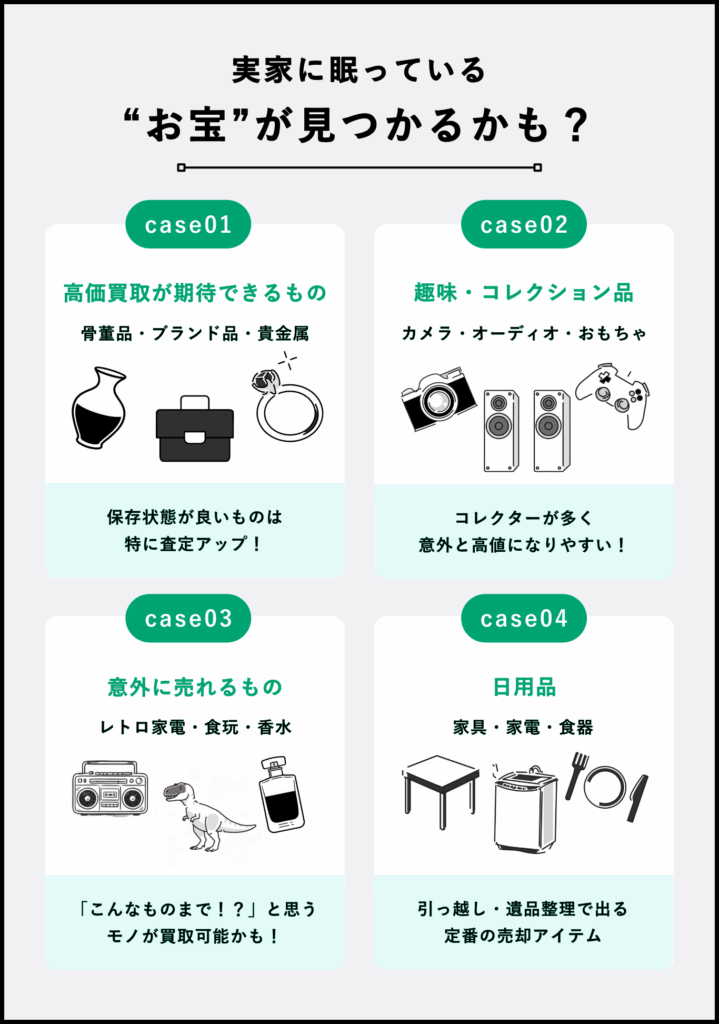 ここでは、実家に眠っているアイテムを、高価買取が期待できるものから日用品まで、カテゴリー別に詳しく解説します。